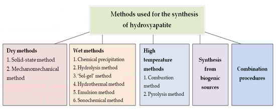 In order to produce synthetic HA with a precise control of its structure, several methods have been described in the literature. Szcześ et al. [4] classified the methods of preparing HA into five categories: (1) dry methods (solid-state, mechanomechanical methods); (2) wet methods (chemical precipitation, hydrolysis, sol–gel, hydrothermal, emulsion or sonochemical); (3) high-temperature processes (combustion, pyrolysis method); (4) synthesis based on biogenic sources; (5) combination methods (such as hydrothermal–microemulsion, hydrothermal–mechanochemical, hydrothermal–hydrolysis, etc.) (Figure 1).