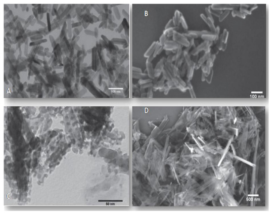 Electron microscopy images (transmission electron microscopy—TEM, and scanning electron microscopy—SEM) of hydroxyapatite nanoparticles synthesized by hydrothermal processes by Arantes et al. [7]: (A) HA nanoparticles obtained at 100 °C, over 24 h, with the precursor concentrations of 0.03 mol/L−1 (TEM, scale bar value 100 nm); (B) HA nanoparticles obtained at 140 °C, over 48 h, with the precursor concentrations of 0.03 mol/L−1 (SEM, scale bar value 100 nm); (C) HA nanoparticles obtained at 100 °C, over 24 h, with the precursor concentrations of 0.1 mol/L−1 (TEM, scale bar value 50 nm) (D) HA nanoparticles obtained at 140 °C, over 48 h, with the precursor concentrations of 0.1 mol/L−1 (SEM, scale bar value 500 nm). Adapted from [7] under the terms of the Creative Commons CC BY license, accessed on 30 May 2021.