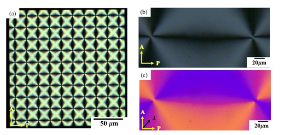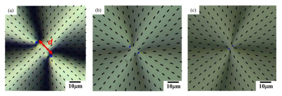 A full-wavelength () optical compensator helped to reconstruct the director field in the nematic cells, Figure 2c. The regions in which the director was parallel to the slow axis of the compensator acquired a blue interference color. When the director was perpendicular to the slow axis, that area appeared yellow. The left defect in Figure 2c was a +1 radial defect, while the right one was a −1defect.