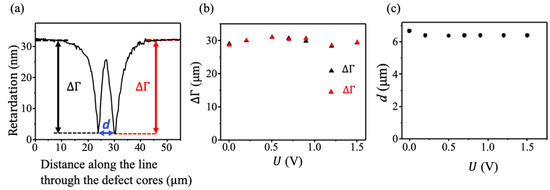 The defects in the observed textures clearly split into pairs of ½ defects, Figure 2b,c, Figure 3, and Figure 4. The split distance was determined as the distance between the minima of the optical retardance, Figure 3a. To verify whether the director remained mainly in plane, we monitored how the phase retardance of the cell changes in the presence of the electric field applied along the -axis normal to the cell. Neither the optical retardance , Figure 3b, nor d, Figure 3c changed when the electric field was applied. The result verifies that the director was confined in the plane of the cell and showed no significant escape into the third dimension: since , a significant escape would lead to an increase of when the field is applied, which was not observed.