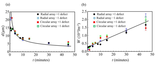 Therefore, the surface anchoring force that tends to keep the half-integer defects as a single core is . At the balance point, , which leads to the expression for the azimuthal anchoring coefficient, . With the known , and measured , we found as a function of irradiation time, Figure 5b.