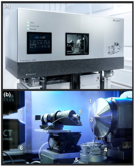 Image and description of the main components of the used system. (a) Exterior view of the system with a temperature-controlled lead booth and air-bearing granite for vibration damping. (b) Inside view into the device with: 1. nano focus X-ray source, 2. exit window and at the same time tungsten transmission target on a diamond substrate, 3. sample mounted on a needle-shaped holder, 4. 6-DOF hexapod made of piezo linear axes for fine adjustment of the sample on the rotation axis, 5. air-bearing rotary stage (and in the picture not visible below three further linear axes for positioning of the sample holder), 6. DECTRIS EIGER2 R CdTe detector on 3 linear axes, 7. DECTRIS detector with SI sensor, and 8. optical microscope to support the sample adjustment.