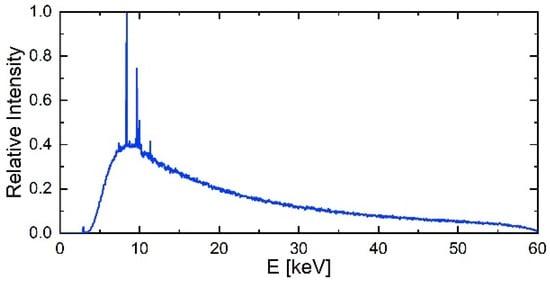 The employed device—the ntCT (Figure 1)—is a cooperative development of the University of Würzburg and the Fraunhofer EZRT and follows the principle of projection magnification. The utilized X-ray source is the Excillum Nanotube N2 60 kV (Excillum AB, Kista, Sweden) [10] with a 500 nm thick tungsten transmission target. According to the specifications, it achieves a 300 nm FWHM electron spot at 200 mW target. This information is consistent with our own investigations [31]. The source features an internal validation of the actual electron spot size as a measure of the achievable resolution. Figure 2 shows a simulated intensity spectrum of the X-rays. In particular, the significant fraction of photons with energies above 10 keV can be exploited in imaging, being advantageous compared to full-field microscopy.