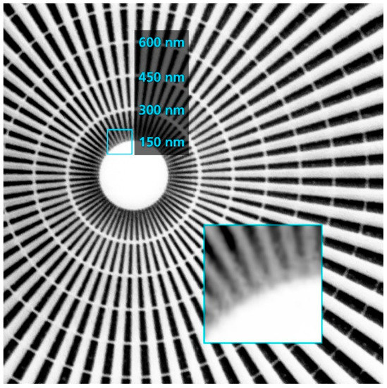 Figure 3 shows the background-corrected image of the Siemens star with an exposure time of 300 s. In the enlarged section, even the innermost lines with the highest spatial resolution of 3300 lp/mm (corresponding to 150 nm half period) are clearly visible.