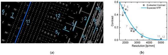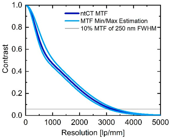 To characterize the system’s modulation transfer function (MTF) as a more quantitative reference for the resolution, in a previous study we have already shown that the MTF of the imaging system (Figure 4) can be approximately described by the superposition of a Gaussian PSF with 250 nm full width at half maximum (FWHM) with an additional background of about 1.1 µm FWHM. This finding could be attributed to the characteristics of the X-ray source by further evaluating the shape of the electron beam on the target. For this purpose, the focus of the electron beam was manually scanned over edges on the patterned transmission target, to obtain an independent measure of the source point spread function by evaluating the radiation intensity measured in this process. For a more detailed description of the method, please refer to the previous study indicated [31]. For the visible resolution, which corresponds to the 10% MTF level, 3200 lp/mm is achieved with the high-resolution portion (narrow PSF). This is consistent with the visible 150 nm structures in the above-shown Siemens star image.