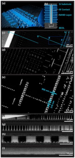 Reconstructed nano CT scan of a semiconductor memory chip from a commercial micro sd card (SanDisk 32 GB microSDHC UHS-I) measured with a sampling of 98 nm. (a) 3D rendering (All 3D visualizations shown in this study were carried out in Avizo 9.0—Thermo Fisher Scientific) of the internal metalized structures, where the individual contacts with an expected size between 100–200 nm can be clearly identified. (b) schematic of a single contact pillar connecting the multiple word lines. (c) volume cross-section from the reconstruction with a memory array in the center and a section of the peripheral circuits to the right. (d,e) enlarged details of the sectional view with dimensions for specific features, (f–i) vertical sections through the volume corresponding to the markings in (c). (f) word line staircase at the edge of the chip. (h,i) vertical view of the peripheral circuits.