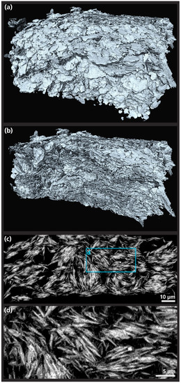 The results of measuring the silicone polymer composite are shown in Figure 9. The picture in (a) shows the 3D-rendered volume of the segmented metal particles from the polymer composite. As stated earlier, it is necessary for the further development of this material class to obtain information on how the flake-shaped filler particles are distributed in the polymer matrix. In particular, the alignment of the particles to each other, directional effects from the production or agglomeration of the flakes have to be determined. It should be possible to make statements on the relative relationship of individual particles as well as to depict a sufficiently high number of particles to enable statistical evaluation and find percolation paths. In order to better access these properties visually, a volume section is shown in (b). Image (c) shows a sectional view of the sample. The sample has previously been subjected to a number of load cycles which led to a clearly visible agglomeration and local densification of the particles. Furthermore, an enlarged section is shown in (d), where the preferred arrangement in stacks and orientation in a horizontal direction is visible.