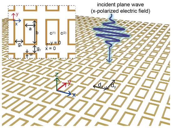 - Decker, M.; Feth, N.; Soukoulis, C.M.; Linden, S.; Wegener, M. Retarded long-range interaction in split-ring-resonator square arrays. Phys. Rev. B Condens. Matter Mater. Phys. 2011, 84, 085416. [Google Scholar] [CrossRef]