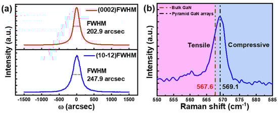 (a) XRD (0002) and (10-12) rocking curves, and (b) Raman spectrum of the as-grown pyramid µLED epitaxial structure on patterned SiO2 layer.