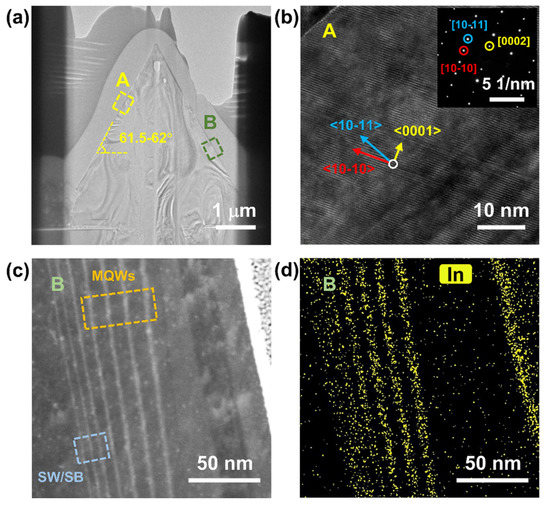 Detailed structural analysis of a single µLED pyramid in the array was characterized by TEM. The test lamella was fabricated using a focused ion beam. From the TEM image of a single pyramid µLED structure (see Figure 3a), a triangular outline is clearly resolved, corresponding to the cross-section of the pyramid. The SiO2 pattern and the opening hole could be clearly identified at the bottom of the pyramid. The top of the pyramid was sharp and the angle between the sidewall and the in-plane was around 61.5°–62°, which is consistent with the above SEM result. Figure 3b shows the high-resolution TEM (HRTEM) image from the place of interest marked by a yellow square in Figure 3a. From selected area electron diffraction (SAED) patterns in the set of Figure 3b, the d-spacing along growth direction was calculated as 5.46 Å, corresponding to the (0002) plane of GaN, confirming the wurtzite structure of epilayer, [0001] growth direction of epilayer, and <10-11> equivalent orientation perpendicular to the sidewall of the pyramid. Cross-section high angle annular dark-field (HAADF) scanning transmission electron microscopy (STEM) and corresponding EDS mapping of In from region B in Figure 3a were performed to evaluate the structure of MQWs, due to their good sensitivity and contrast to elements with different atomic numbers (see Figure 3c,d). The results indicate that three-period InGaN/GaN shallow quantum well and four-period InGaN/GaN MQWs exhibited obvious light and dark stripes. The separate dark stripe near the sidewall represented the AlGaN electron barrier layer, aiming to block the electron roll-over effect under the operation of high current density and further reduce the probability of electron-hole pair non-radiative recombination.