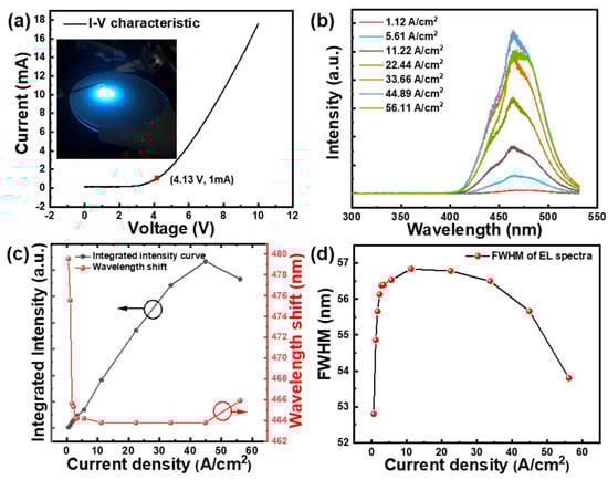 The electrical luminescence picture from the µLED array in the inset of Figure 4a exhibited a uniform blue light emission on the wafer. The EL spectral spectra of the µLED array at different injected current densities (from 1.12 to 56.11 A/cm2) were also collected (Figure 4b). The EL peak position and EL integrated intensity as a function of injected current densities are summarized in Figure 4c. As the current density increased, the EL peaks first blue-shifted about 16 nm (current density from 1.12 to 11.22 A/cm2), then maintained stability at 463.8 nm in a wide range (current density from 11.22 to 44.89 A/cm2), and eventually exhibited a redshift of about 2.1 nm (current density from 44.89 to 56.11 A/cm2). The large blue shift could be largely attributed to different active regions, which have various strain states, to In atoms in the localized regions, or to the MQWs structure on (0002) plane [30,31]. In addition, the screening of charge to the built-in electrical field within the MQWs and the band filling effect as injected current density increased could also lead to a reduction in QCSE for the emission wavelength [32]. The bandgap of semiconductors decreases with increasing temperatures when self-heating effects start to take over at a high injected current density of LED, which causes redshift in the LED emission wavelength [33]. The EL integrated intensity increased first in a large current density range of 1.12–44.89 A/cm2 and then decreased [34]. This is presumably attributed to the electrical breakdown of individual pyramid µLEDs at high current densities. As shown in Figure 4d, weak fluctuations centered at 56 nm FWHM of pyramid µLED array were observed. The wide EL spectrum is due to the native fluctuation of indium composition in the InGaN layer and the uneven thickness of the quantum well deposited on the semipolar plane of nitride [31,35]. The FWHM reached a maximum when the operating current density was 11.22 A/cm2.