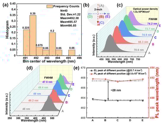 (a) The standard frequency distribution histogram of the PL peak wavelength. Number of samples (N) is 40; (b) Schematic diagram of locations of interests for PL spectroscopy, among which labels “1–40” represent the samples and labels “A–E” represent five samples with representative characteristics; (c) PL spectra (at an optical power density of 1.6 × 106 W/cm2) and (d) EL spectra (at injected current density of 33.7 A/cm2) of the five samples; (e) EL and PL peak wavelengths of the five samples at different positions.