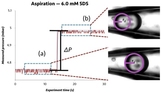 Aspiration of a droplet of 5CB in an aqueous surfactant solution (6.0 mM SDS). The difference in pressure values obtained from (a) before and (b) after the aspiration (), along with the corresponding radii of curvature before and during aspiration ( and , respectively), are then inserted into Equation (1) to obtain the interfacial tension .