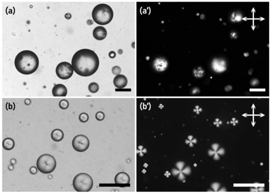Micrographs of a bulk sample of an aqueous solution containing 5CB droplets, using (a) and (a′) PVA, to promote tangential alignment; and (b) and (b′) SDS, to induce normal alignment. Images are viewed (a) and (b) with a single polarizer and (a′) and (b′) between crossed linear polarizers. Even without crossed polarizers, a characteristic texture when droplets are normally aligned is clearly visible in (b), which allows us to verify the droplet alignment. Scale bars 100 μm.
