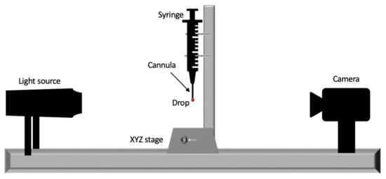 Measurements of using the pendant drop method were performed for 5CB both in air and in aqueous phases, using a “SURFTENS universal” set-up from OEG Gmbh. The set-up is equipped with a base plate, an sample stage, a manual dosing system, a USB camera with 6.5× zoom lens, and a white LED, and is controlled by the software “SURFTENS PD”. A schematic of the experimental set-up is shown in Figure 4. After the calibration, we need to provide the density of the LC and of the surrounding medium. To measure the surface tension (air is the external medium) of 5CB, we filled 500 μL into a glass syringe connected to a cannula (blunt end needle) with an inner diameter of 0.20 mm. Because of the pressure generated in the syringe while filling the LC, it came out of the cannula in a droplet shape. Once the droplet was stable without any oscillations, we began to measure using the “measuring window” option in the software.