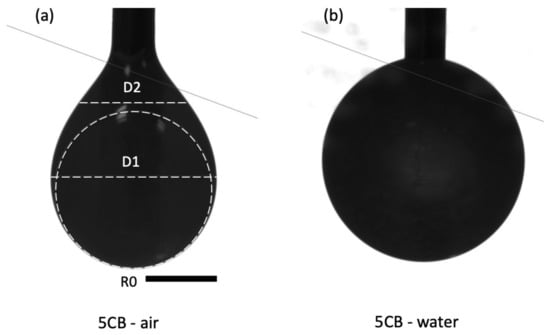 Measurements in water and in surfactant solutions, however, were inconclusive. Pendant drop measurements are optimal in regimes of intermediate Eötvös/Bond number: that is, , where and L is a characteristic length (often the radius of curvature of the droplet, ), with best results when Eo is close to unity [7,8]. With the reported density of 5CB within the range of 1.008 to 1.03 g·cm, the relevance of then becomes problematic for determining the Eötvös number. For a typical pendant drop volume of 100 μL, using our experimentally-determined values for the interfacial tension of 5CB against water without surfactant (∼30 mN · m):