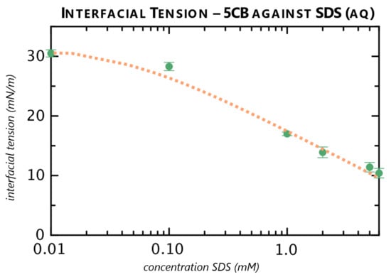 Interfacial tensions of 5CB against aqueous SDS solutions of various concentrations below critical micelle concentration. Data adapted in part from Honaker et al. [21] and reproduced with permission from the American Chemical Society.