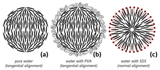 To achieve the desired alignment, however, we can instead make use of the sensitivity of LC alignment to its surrounding environment. This is, of course, fundamentally an effect of the non-zero for each medium in contact with the LC. Pure water promotes tangential alignment, while the presence of a surfactant favors normal alignment; however, the surfactant inherently decreases [8], reflecting the fact that an aqueous surfactant solution is a quite different medium from pure water. In practice, experiments with pure water are notoriously difficult due to wetting issues and poor droplet stability, hence stabilizers are added regardless of which alignment is desired. To ensure a stable interface with water with tangential alignment, the standard choice is to add a water-soluble polymer, such as polyvinylalcohol (PVA) [27,28]. As with the case of surfactant addition, the introduction of PVA changes the medium from pure water. While PVA is often not thought of as a surfactant, solutions of polymers such as PVA have been shown to have some degree of surface activity [2,29], hence we cannot simply assume that the value of of an LC in contact with aqueous PVA solution is identical to that of an interface with pure water, although the alignment is the same.