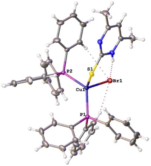 The title compound crystallizes in a monoclinic crystal system with P21/c symmetry forming a monomeric complex with four formula units per unit cell (Z′ = 1). Fractional atomic coordinates, atomic displacement parameters, site occupancy factors, bond lengths, bond angles, and torsion angles are shown in Tables S1–S6 of the Supplementary Materials. Figure 1 shows the molecular structure of [CuBr(PPh3)2(C6H8N2S)]. The geometrical feature of the molecule resembles the parent [CuBr(PPh3)3] complex and other similar Cu(I) halide complexes with CuXSP2 cores [,,,,]. The heavily distorted tetrahedral coordination of the copper compound is realized by the S-atom of the –thione, the P-atom of phosphine, and bromo ligands. The bond angles of the CuBrSP2 tetrahedron varied between 98° and 125°, which notably deviates from the ideal tetrahedral angle (109.4°). The largest deviation of 125° is observed for the P–Cu–P angle, which is more than 6° wider than the P–Cu–P angle (119°) found in [CuBr(PPh3)3].