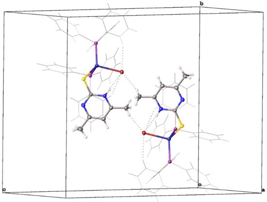 This type of tetrahedral distortion is very common in similar complexes [,,] and is mainly attributed to the valence-shell electron-pair repulsion and/or steric imposition of the bulky triphenyl-phosphine group. The distortion of the tetrahedral coordination around an atom can be judged by the so called τ4 parameter (τ4 = [360−(α + β)]/141, where α and β are the largest angles around the central atom), whose value should be equal to one for exact tetrahedral and zero for square planar coordination. For the title compound, τ4 = 0.93 is slightly higher than the τ4 = 0.90 of the [CuBr(PPh3)3] complex, which means that the overall tetrahedral character around the Cu-atom was not substantially altered by the substitution of the PPh3 group by the –thione ligand. In general, all the interatomic distances are comparable to the corresponding distances reported in identical Cu-complexes [,,,,,]. In the title compound, the Cu–Br distance (2.5412(2) Å) is slightly longer, while the Cu–P average distance of 2.275 Å became shorter compared to the respective distances (2.497(1) Å and 2.333 Å) observed in the parent compound, which is related to the thione-S donor substitution in the title compound. The intramolecular hydrogen bridges are formed between the amine group (D1 = N1) of the pyrimidine–thione ligand, the phenyl ring of the phosphine group (D2 = C8 and C32) and bromine acceptor (A = Br1) with D···A distances d(D1···A) = 3.233(1) Å, d(D2···A) = 3.661(9) Å, 3.841(2) Å, respectively. These intramolecular H-bonding distances are in the same range as those found in similar structures. The macromolecular feature of the [CuBr(PPh3)2(C6H8N2S)] complex is established by the intermolecular hydrogen bonding of the bromine acceptor created by symmetry operation 1−x, 1−y, 1−z to the methyl group (D3 = C42) of the pyrimidine–thione ligand forming a centrosymmetric dimer (Figure 2). The intermolecular hydrogen bonding distance of d(D3···A) = 3.879(1) Å is slightly longer than the intramolecular hydrogen bridges. This type of structural feature was also observed in the crystal structure of [CuBr(PPh3)2(MTUC)] []. The intra- and intermolecular hydrogen bonding distances are compiled in Table S7 of the SI. No π–π stacking was observed in the crystal structure of the title complex.