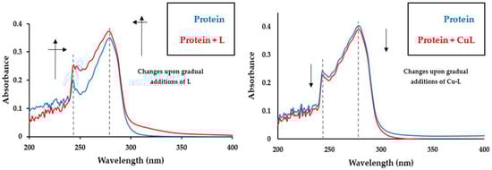 Changes in the absorption spectrum of HSA upon titration with L (left) and Cu-L (right).