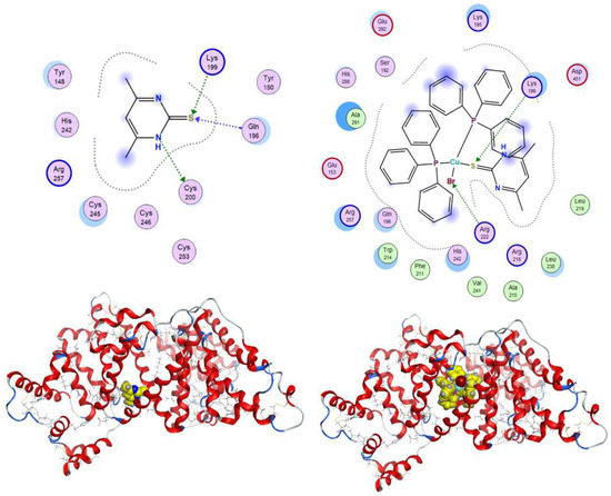 Molecular docking is a powerful tool for computer-assisted drug design with the aim to predict a drug’s key binding modes with the 3D structure of the biomolecular target. Docking can be utilized to justify experimental results and extract structural–property relationships, which are significant for further optimization []. The docking study was conducted to gain insight into the binding sites and the potential interactions of the compounds in the protein microenvironment []. The lowest five binding energies of the two forms of the ligand (thiole and thione) and its copper complex were obtained. For the ligand, the docking scores suggest that the thione form has a slightly better docking score than the thiole form. Hence, the thione form will be discussed in detail. The docking results suggest that the thione ligand binds in the pocket between subdomain I B and subdomain II A, forming hydrogen bonding with Gln 196, Lys 199, and Cys 200 (Figure 4) []. This explains the strong impact induced by the ligand on the spectrum of the protein (at 240 nm) since cysteine units are responsible for the α-helix structure. The presence of the ligand in this area may allow for hydrophobic interactions with tryptophan (214), phenylalanine (149, 156, 157, 165, 206, and 211), and tyrosine (148, 150, and 161) amino acids available in this area. In contrast, Cu-L has a better binding score toward HSA than that calculated for the ligand (Table 2). The data indicate that Cu-L has a strong preference to bind exclusively to subdomain II A (Figure 4). The complex forms some H-bonding interactions with Lys 199 and Arg 222; there is proximity for Cu-L with any cysteine unit, which explains the small impact of the molecule on the α-helix structure. However, the binding site of Cu-L is surrounded by several tryptophan, phenylalanine, and tyrosine amino acids, which may allow for weak electrostatic, hydrophobic, and/or van der Waals interactions with Cu-L. The dramatic difference in the binding sites for L and Cu-L rationalize the spectral changes induced by the molecule–protein binding.