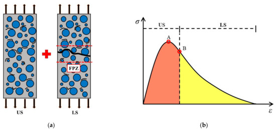 According to the macroscopic experimental phenomena, the deformation and failure of the concrete specimen under uniaxial tension seems to be divided into two stages, the uniform damage stage (US) and the local fracture stage (LS), as shown in Figure 1a. In the uniform damage stage, the whole specimen remains uniformly loaded and deformed, with the damage evolving mainly by the nucleation and growth of micro-defects, which randomly distribute in the whole specimen. In the local fracture stage, a macroscopic main-crack perpendicular to the tensile direction forms in the fracture process zone (FPZ). The macroscopic response of the specimen strongly depends on the size of the largest crack with a preferential orientation in the FPZ. Local further damage and fracture occurs in the FPZ, while the rest of the region of the specimen shows the unloading behavior.
