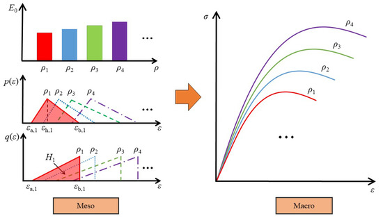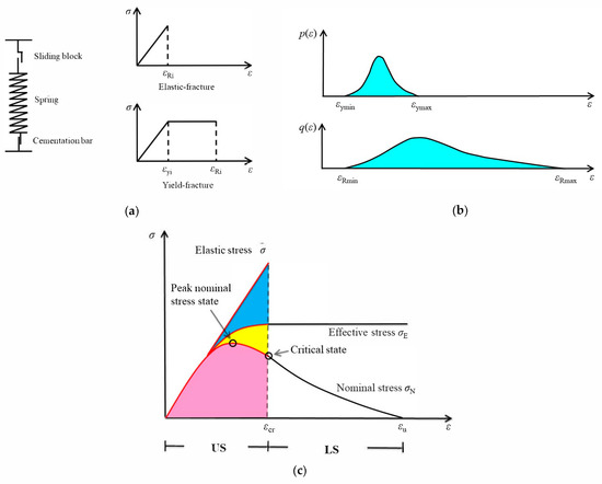 In this model, each micro-bar is composed of spring, cementation bar, and sliding block. The micro-bar i has two feature strains, i.e., the fracture strain and the yield strain , and it may have two kinds of failure modes (elastic-fracture and yield-fracture) according to the values between and (as shown in Figure 2a). By introducing some simplifying assumptions, the two kinds of damage evolution process in the meso-scale are decoupled (further detailed discussion can be referred to from Chen et al. [35]). As shown in Figure 2b, and are the independent probability density functions to and , respectively; where denote the minimums of and ; are the corresponding maximums. In the course of damage evolution, the cross-sectional area in the initial state will gradually transform into three parts, i.e., , , , denoting the cross-sectional areas corresponding to the fractured bars, the yielded bars, and the bars in elastic state, respectively. is the effective cross-section area bearing load. It satisfies and .