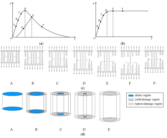 A typical nominal stress–strain curve and a predicted effective stress–strain curve under uniaxial tension are shown in Figure 3a,b. Signs D and E denote the peak nominal stress state and the critical state, respectively. A denotes the limit elastic state, B and C denote two states in strengthen segment, and denote two states in soften segment. The uniaxial tensile damage evolution process of concrete is simulated by using the microscopic spring beam model and the cylinder model, respectively.