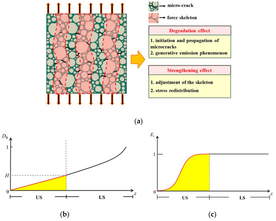 A novel fundamental assumption of mesoscopic damage for concrete material was proposed by Chen et al. [35]. As shown in Figure 4a, it indicated that the damage evolution of concrete materials could be summarized as two kinds of mechanisms on a mesoscopic scale. On the one hand, with the increase of deformation, the initiation, propagation, and coalescence of micro-cracks and micro-defects, as well as the acoustic emission phenomenon, will occur randomly in the microstructure, which is the so-called degradation effect. On the other hand, due to the initiation and propagation of microcracks, stress redistribution and adjustment of force skeleton will take place in the microstructure. We may be able to understand the second mechanism as the active adjustment of the material system itself. In this way, the force skeleton of the microstructure is further adjusted and optimized, and the potential mechanical ability of the material is further developed to bear more external loads (effective stress). Therefore, the second type of mechanism is called the strengthening effect here. Berthier et al. [24] indicated the quasi-brittle failure emerges from the interaction between the elements constituting the material. They also highlighted the central role played by the mechanism of load redistribution to control the failure behavior of quasi-brittle solids.