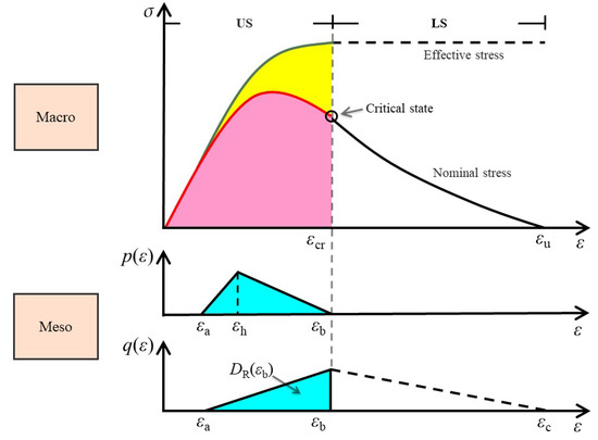 According to the statistical damage theory mentioned above, the macroscopic mechanical behavior (nominal/effective stress–strain curve) of concrete under uniaxial tension, is determined by the cumulative evolution process of the fracture and yield damage modes in a meso-scale, as shown in Figure 5. The whole process includes the homogeneous damage accumulation stage and local failure stage. Two characteristic states are distinguished, namely peak nominal stress state and critical state. and denote the strains of critical state and ultimate state in the nominal stress–strain curve.