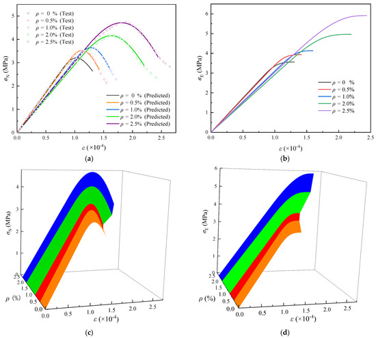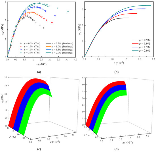 As shown in Figure 11a, the predicted nominal stress–strain curves relevant to the homogeneous damage phase agree well with the test curves. The predicted effective stress–strain curves are shown in Figure 11b. The calculation parameters are listed in Table 4. The 3-D envelopes of - and - curves predicted are shown in Figure 11c,d, in order to better show the variation trend of the curves. It clearly shows that the shape of the curves has obvious similarity law with the increase in the volume ratio of steel fiber. With the increase of from 0.5% to 2.0%, the stresses and strains relevant to the peak nominal stress state and the critical state increase significantly. The change of the slope of the descending section of the nominal stress–strain curves is not obvious, meanwhile the ductility is further improved.