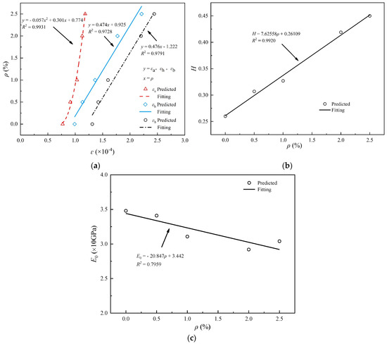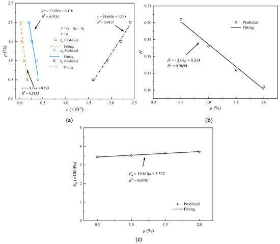 Figure 12a shows the relationship curves of -. With ranging from 0.5% to 2.0%, decreases linearly from 0.394 × 10−4 to 0.194 × 10−4, decreases linearly from 0.164 × 10−4 to 0.030 × 10−4, meanwhile increases linearly from 1.601 × 10−4 to 2.411 × 10−4. Figure 12b shows the relationship curves of -, H decreases linearly from 0.202 at 0.5% to 0.162 at 2.0%. Figure 12c shows the change curve of with , which has no obvious changes. The fitting curves and fitting functions of the above five parameters are also shown in the figures.