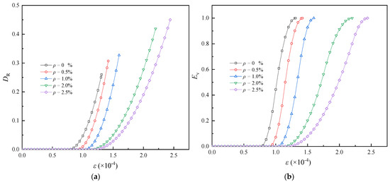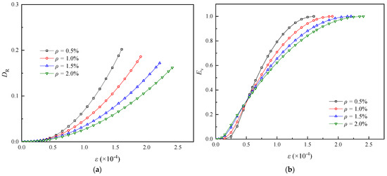 Evolution curves of damage variable and evolution factor: (a) DR-ε curves; (b) Ev-ε curves.