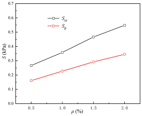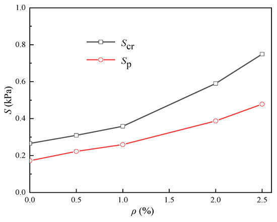 Figure 14 shows the change curves of Sp and Scr with . With the increase in the fiber content from 0.5% to 2.5%, Sp increases from 0.161 to 0.345 kPa, Scr increases from 0.266 to 0.548 kPa; and the difference between Scr and Sp increases from 0.105 to 0.203 kPa. The results show that the potential mechanical properties of materials could be fully considered if the energy absorption capacity corresponding to the critical state is adopted.