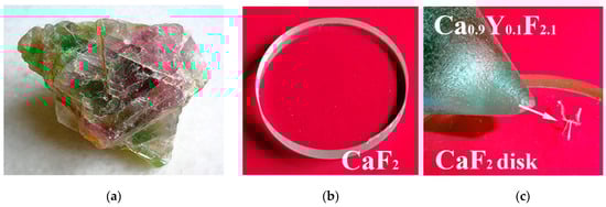 Of all the MF2–RF3 systems in which congruently melting fluorite phases M1–xRxF2+x are formed, it was the Ca1–xYxF2+x crystals in the CaF2–YF3 system that were the first to be obtained by spontaneous crystallization of a melt []. They should still be recognized as the most promising optical fluoride multicomponent material with improved properties compared to commercially produced CaF2 optical crystals (Figure 1b). The isomorphic introduction of yttrium into CaF2 is accompanied by a several-fold increase in hardness compared to CaF2, which makes it possible to engrave a CaF2 crystal with Ca1–xYxF2+x (Figure 1c).