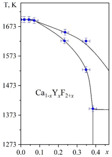 The phase diagram of the CaF2–YF3 system (Figure 3) was investigated and published in []. The temperature dependence of the solubility of YF3 in CaF2 from 1123 K to the eutectic temperature of 1393 K is practically absent. The ultimate solubility of YF3 in CaF2 is defined as x = 0.38. The coordinates of the maximum on the melting curves of Ca1–xYxF2+x, found by the DTA are x = 0.11 ± 0.02 and 1695 ± 5 K [].