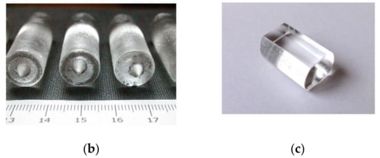 In a process of finishing of optical products (lenses, prisms, etc.) of complex shapes from fluorite crystals, chips occur along the characteristic planes (111) of perfect cleavage (Figure 2a). This reduces the yield of products and, accordingly, leads to an increase in the cost of the final product. Ca1–xYxF2+x crystals lose their perfect fluorite cleavage and acquire a conchoidal fracture (Figure 2b,c). The deterioration of cleavage significantly simplifies the process of manufacturing of structural optical elements.