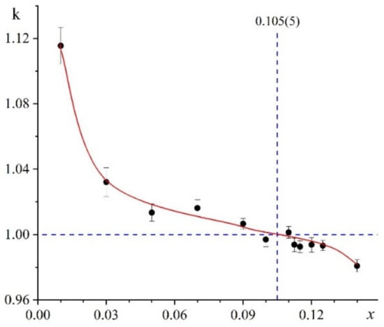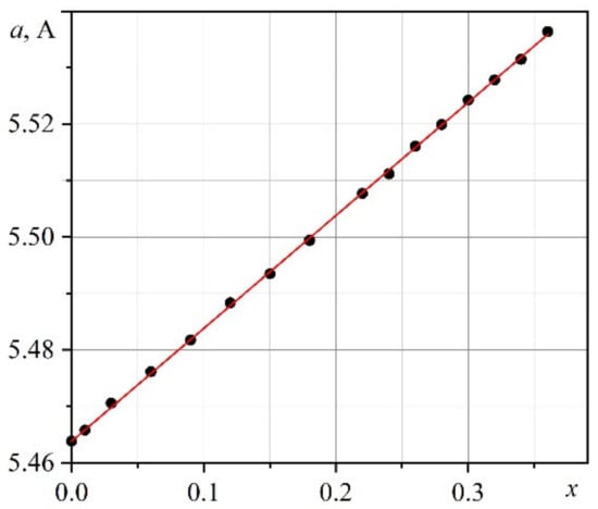 The concentration dependence of the lattice parameter obtained obeys Vegard’s law for the entire range of the studied concentrations up to x < 0.37. Table 2 shows the precision (δ) of the determination of the unit cell parameter and the coefficients of the Vegard equation obtained in this work and in the previous ones [,,].