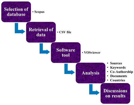 Numerous publications have been written in the area under study, and it is critical to locate the most accurate database. According to Aghaei et al. [59], the two most effective, comprehensive, and objective databases for conducting literature searches are Web of Science and Scopus. Scopus has a broader coverage and more up-to-date bibliometric data than Web of Science [59,60,61]. Scopus was used to compile the bibliometric data for the current analysis on the utilization of WG for sustainable construction. The searched keyword in Scopus was “waste glass in concrete”, which resulted in 1488 documents. Options for data refinement were used to weed out irrelevant publications. From the “document type”, only “article” and “review” were selected. The “source type” field was kept to “journal”, while the “language” field was “English”. The “publication year” was limited from 2001 to 2021. The “subject area” was kept “Engineering, Material Science, and Environmental Science”. After applying these limiting filters, the resulting documents were 737. Researchers from a variety of fields have previously conducted research using similar methods [62,63,64]. Scientometric reviews make use of science visualization, a technique developed by scholars for analyzing bibliometric data for a variety of purposes [65]. It describes the difficulties researchers face when conducting manual reviews and also establishes a connection between sources, keywords, authors, articles, and countries within a particular research area [66]. Scopus data were saved in the Comma Separated Values (CSV) format for subsequent analysis with an appropriate software tool. The science mapping and visualization were created using the software tool VOSviewer (version: 1.6.16). VOSviewer is a freely available visualization application that is widely used in a variety of fields and comes highly recommended in the literature [67,68,69,70,71]. Hence, the VOSviewer was used to accomplish the current study’s objectives. The analysis was conducted in VOSviewer, with the “type of data” set to “create a map from bibliographic data” and the “data source” set to “read data from bibliographic database files”. The CSV file downloaded from Scopus was imported into VOSviewer and analyzed in a few simple steps while ensuring data consistency and reliability. As part of the science mapping review, the sources of documents, keyword co-occurrence, citation network, co-authorship, articles, bibliometric overlapping, and country contributions were analyzed. Additionally, the cumulative number of citations to articles was tallied. Additionally, the connections between authors, publications, and countries were charted. Maps were used to visualize various parameters, their relationships, and co-occurrence, while tables were used to summarize their quantitative values. Additionally, the keywords were thoroughly reviewed and summarized in the discussion section in order to develop the major research themes. The sequence of the scientometric analysis is depicted in Figure 1.