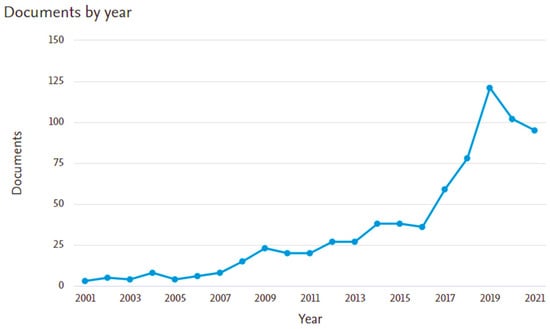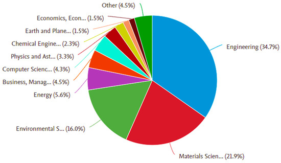 The Scopus analyzer was used to search the Scopus database in order to determine the most significant research areas. The analysis revealed that the top three fields based on the number of documents were determined to be Engineering, Materials Science, and Environmental Science, containing 34.7%, 21.9%, and 16.0% of the total documents, respectively, as illustrated in Figure 2. These fields account for around 72.6% of the total number of documents searched in the Scopus database. Both journal articles and review articles were compared for the overall documents. Journal articles contributed 90.9%, and review articles contributed 9.1%, respectively. Figure 3 depicts the annual publication pattern in the current study field from 2001 to 2021. A gradual increase in the number of publications on the utilization of WG in concrete has been observed up to 2016. However, a remarkable increase was observed in the last 5 years. It is fascinating to discover that scholars are now focusing their studies on sustainable construction methods.