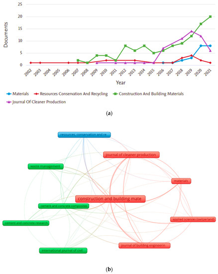 Mapping sources enables the analysis of development and innovation to be visualized. These sources make data available within the confines of predefined, unique constraints. By initializing the mapping of research origins, it is possible to apply the research pattern sequentially in the analysis area. This analysis was conducted in VOS viewer using Scopus bibliometric data. The “type of analysis” was selected to be “bibliographic coupling,” and the “unit of analysis” was selected to be “sources”. A source’s minimum document count was set at 10, and 10 of the 256 sources met this criterion. Table 1 lists the leading sources/journals that publish at least 10 documents containing data on WG in concrete for sustainable development, along with their citations and total link strength. Based on the number of documents, the top 3 journals are construction and building materials, the journal of cleaner production, and the international journal of civil engineering and technology, containing 112, 56, and 25 documents, respectively. The highest citations are of construction and building materials (3989), followed by cement and concrete research (1935) and journal of cleaner production (1878). Figure 4 illustrates the annual publication trend of sources and their scientific mapping. This data was gathered as part of the process of establishing a network of research sources. It is worth noting here that this type of research would lay the groundwork for upcoming scientometric reviews in the current study field. Additionally, previous manual reviews lacked sufficient detail regarding science mapping. Figure 4a depicts the yearly publication trend of the top journals. The contribution of resources, recycling and conservation is from 2002. While the contribution of construction and building materials, journal of cleaner production, and materials is from 2007, 2009, and 2016, respectively, in the current study field. It can be seen that up to 2016, the number of publications was insignificant, while an abrupt hike in the last 5 years was observed especially for construction and building materials. The network visualization of journals containing at least 10 documents has been displayed in Figure 4b. The size of the frame in the figure corresponds to the journal’s contribution in terms of citation and documents count; a larger frame size indicates a higher contribution. For example, construction and building materials has a bigger frame size, indicating that this journal has the greatest influence in the current study area relative to the other. Additionally, frames (sources) with identical colors display clusters of related frames developed through VOSviewer analysis. For instance, the red color indicates a cluster containing construction and building materials, journal of cleaner production, materials, journal of building engineering, and applied sciences (Switzerland). Clusters are formed based on the scope of research outlets or their co-citations. [72]. The number of co-citations in the articles in the current study area is indicated by the connection links between the research sources. Additionally, the link strength indicates the number of mutually cited references between two journals. For instance, the journal of cleaner production (total link strength: 9941) contained the greatest number of references to other research sources. Closely spaced frames (sources) in a cluster have stronger connections than those that are further apart. For example, the construction and building materials is more connected with cement and concrete composites than it is with other sources.