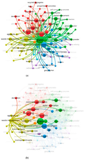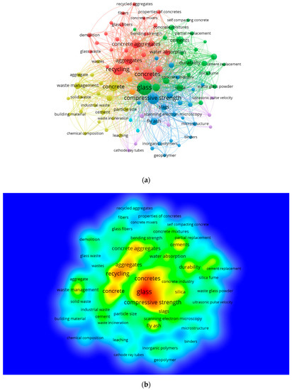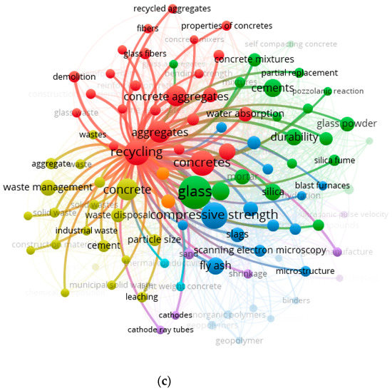 Keywords are essential research materials because they identify and represent the research domain’s fundamental field [73]. For that analysis, the “type of analysis” was chosen as “co-occurrence” and “unit of analysis” as “all keywords”. The minimum number of occurrence of a keyword was kept to 20. These constraints indicated that only 100 keywords from 5576 satisfied the criteria. Table 2 lists the top 20 keywords having the most occurrence in the research articles used in the present study field. According to the researcher’s study, the most commonly occurring keywords include glass, compressive strength, concretes, recycling, and concrete, making the top 5 mostly occurred keywords. Figure 5 illustrates the co-occurrence of keywords networks, their visualization, their connections to one another, and the density associated with their correlation frequency. The size of the keyword node in Figure 5a indicates its frequency, whereas its location indicates its co-occurrence in publications. Additionally, the visualization demonstrates that the aforementioned keywords have bigger nodes than the others, indicating that these are the most important keywords in the study of WG utilization in concrete for sustainable construction. Clusters of keywords have been colored differently in the network to indicate their co-occurrence in various publications. A total of five clusters were observed, represented by green, red, blue, yellow, and purple. For example, a cluster represented by green color contains glass, silica, cements, durability, silica fume, cement replacement, concrete mixtures, etc. As illustrated in Figure 5b, the density concentration of keywords is denoted by distinct colors. Red, yellow, green, and blue are the colors in ascending order of density. For example, glass, compressive strength, and concretes have red marks in the density visualization, indicating a higher density. This finding will aid writers in the future when selecting keywords to make it easier to locate published data in a particular domain. Figure 6 illustrates the connections of glass (Figure 6a), waste management (Figure 6b), and recycling (Figure 6c) with other keywords. The connection network demonstrates that glass and recycling have a sizeable impact on waste management. Thus, recycling WG would reduce the burden from waste management authorities.