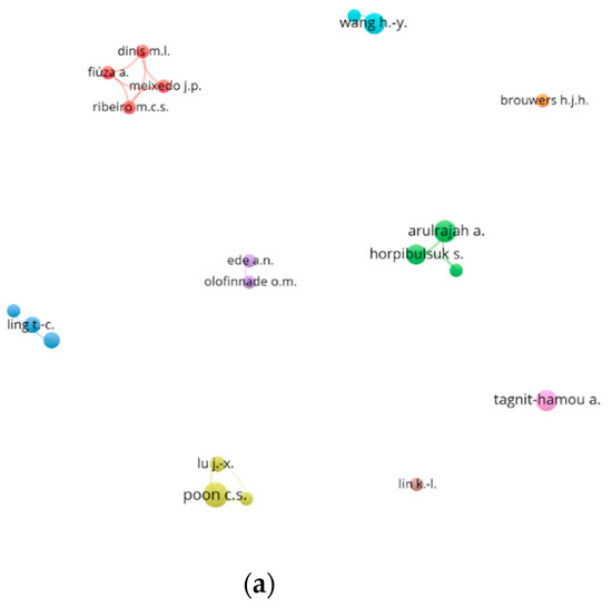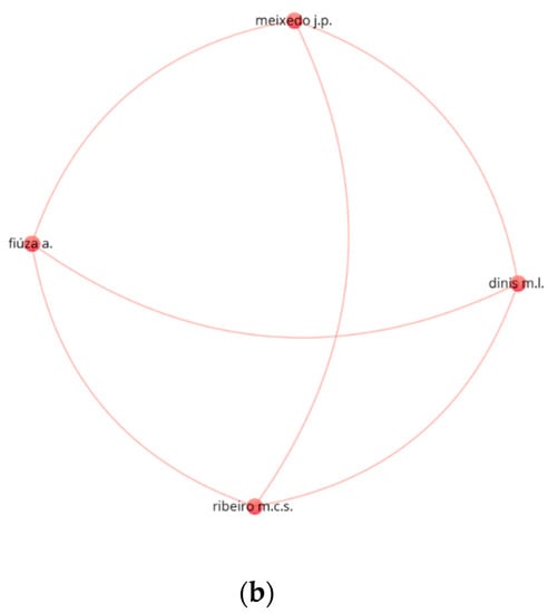 Visualization of co-authorship; (a) authors with minimum five documents; (b) connected authors.