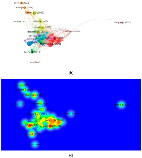 Mapping of documents; (a) documents with minimum 100 citations; (b) connected documents based on citations; (c) density of connected documents.
