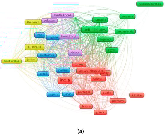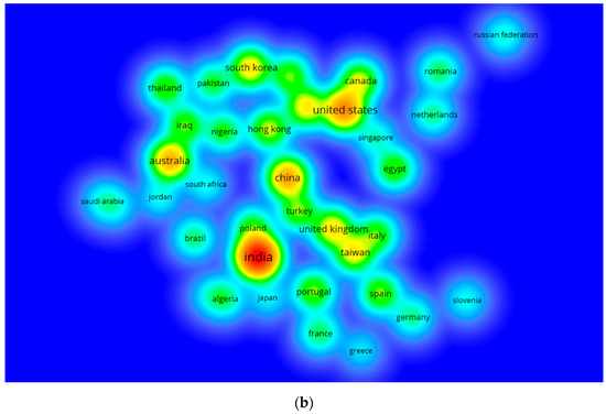 Certain nations have contributed more than others in the current research domain in the past and continue to do so. The visualization network was developed to help readers visualize regions that are deeply committed to sustainable construction. The “type of analysis” was “bibliographic coupling”, and the “unit of analysis” was “countries”. The criterion for a country’s minimum number of documents was set at 5, and 37 of 87 countries met the criterion. The top 20 active nations are listed in Table 5 based on the number of documents and citations related to the present study area. India, United States, and China contributed the most documents overall, with 126, 63, and 52 documents, respectively. While the United States, Australia, and United Kingdom were the top three participating countries in terms of citation count, with 2778, 2098, and 1857 citations, respectively. The number of documents, citations, and total link strength indicates a nation’s influence on the evolution of the current research domain. The total link strength indicates the extent to which a country’s documents have influenced the other countries participating in these studies. The United States had the strongest total link strength in comparison to other countries, followed by Australia and China. As a result, the aforementioned countries were determined to have the greatest influence on the utilization of WG in concrete for sustainable construction. Figure 9a,b illustrates the countries’ connectivity and density visualization of countries that are connected through citations. The frame’s size indicates the country’s contribution to the field of study. Additionally, the density visualization demonstrates that the countries with the highest participation had a higher density. Future researchers will be aided in establishing scientific collaborations, producing joint venture reports, and sharing innovative techniques and ideas by the graphical representation of participating countries.
