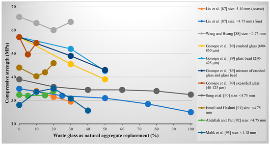 According to the literature, there is a detrimental effect on CS of composites containing WG as a partial or complete substitute of NA, as shown in Figure 10. Mostly, a decreasing trend is observed with the increasing replacement ratio of WG. However, using a smaller size WG at a lower replacement ratio can enhance the CS by filling the voids in the matrix. Liu et al. [87] found a decrease in CS by 2.9%, 10%, and 15.7% when coarser WG (5–10 mm) was used at 10%, 20%, and 30% content, respectively. Though, using finer WG (size: <4.75 mm), the reduction in CS was minimal. They reported two primary explanations for this decline. Firstly, the WG aggregate has a lower strength than the NA aggregate, and secondly, the smooth surface of the WG aggregate affects its binding with cement paste, reducing the strength of the concrete. A similar pattern of reduction in CS with the increasing amount of WG in composites as an aggregate replacement was also noted by other researchers [88,89,90]. Conversely, Ismail and Hashmi [91] and Abdallah and Fan [92] found a 4.3% and 4.9% increase in CS, respectively, when fine aggregate was replaced at 20% by WG. Similarly, Malik et al. [93] investigated the CS of composites containing finer WG particles (size: <1.18 mm) at various replacement ratios. The results revealed that composites containing 10%, 20%, and 30% WG enhanced the CS by 20.0%, 25.1%, and 9.8%, respectively, compared to the reference mix. However, at 40% replacement ratio, the CS decreased by 8.5% than the reference mix, as shown in the figure. Thus, the use of finer WG at a lower replacement ratio could enhance the CS by filling voids in the matrix, while coarser WG reduces the CS because of weak ITZ between WG aggregate and cement matrix.