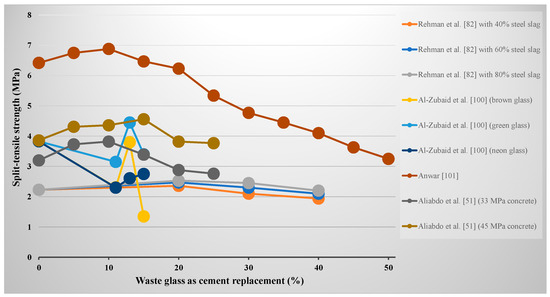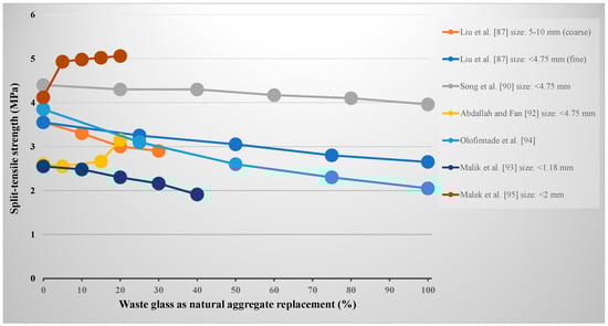 The WG usage as an NA replacement also has an unfavorable effect on the STS of composites, as depicted in Figure 11. The STS decreases with the increasing replacement ratio of WG, as reported by most researchers [87,90,93,94]. Liu et al. [87] reported a decrease in STS than that of reference mix by 8.5%, 14.1%, 21.1%, and 25.4% when WG replaced natural fine aggregate at 25%, 50%, 75%, and 100% ratios, respectively. Song et al. [90] found a decrease in STS compared to control mix by 2.3%, 2.3%, 5.2%, 6.8%, and 10% when NA was replaced by 20%, 40%, 60%, 80%, and 100% WG, respectively. However, Abdallah and Fan [92] and Malek et al. [95] found an increase in STS of WG composites than NA composites using lower content (up to 20%) of WG. It can be concluded that WG with smaller particle size and used in lower proportions positively influences the STS of composites.
