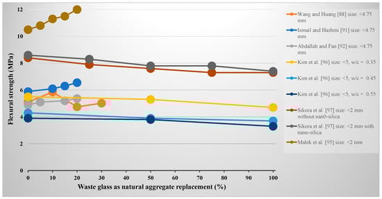 Figure 12 depicts the influence on FS of composites with increasing WG content as the NA replacement. It shows that at lower WG content, the FS of composites can be improved, while higher WG content results in decreasing FS. However, the reduction in FS is minimal compared to CS and STS. Wang and Huang [88] found improvement in FS of 14.7% at a 10% replacement ratio, while a further increase in WG decreased FS compared to the reference sample without WG. The study of Ismail and Hashmi [91] and Abdallah and Fan [92] reported improvement in FS of WG aggregate composites in comparison with the NA composites. The improvement in FS with WG addition may be attributed to the pozzolanic properties of glass, which helped to improve the microstructure of the matrix [91]. Kim et al. [96] and Sikora et al. [97] observed a drop in FS of WG composites in comparison to the NA composites. The reduction in FS was more at higher WG content as aggregate replacement. This could be because the smooth surface of WG relative to the NA having lower adhesion to the surrounding matrix than that of NA. However, Malek et al. [95] reported increasing FS with increasing WG percentage up to 20% with an increment of 5%. At a 20% replacement ratio, the FS increased by 14.3%. The reason is the use of fine WG (size: <2 mm), which helped improve the microstructure by filling pores in the matrix. Thus, the use of WG can improve the properties of composites if used in smaller sizes and lower replacement ratios. This is because the finer WG can improve the microstructure by filling voids in the matrix [93]. In addition, a higher replacement ratio and a larger size of WG used as NA replacement reduced the properties of composites. This may be attributed to the more glass-matrix interfaces, and the smooth surface of WG may reduce the interfacial bond strength, resulting in decreased strength of composites [90].