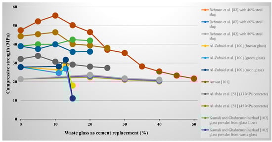 Islam et al. [98] performed a CS test on mortar specimens containing recycled WG as cement replacement. Compared to controlled mortar specimens, recycled WG mortar had a lower CS at the age of 7, 14, 28, and 56 days. At 90 days, an increase in CS was observed; the highest CS was obtained with a 10% cement replacement. Similarly, 15% cement replacement at 180 days and 20% cement replacement at 365 days exhibited maximum CS. The reason could be the pozzolanic behavior of glass, which reacted slowly and improved the microstructure of the matrix at later ages and resulted in improved CS. Figure 13 is generated based on the past studies depicting the variation in 28-days CS with increasing WG content as cement replacement. A slight increase in CS can be observed at lower replacement ratios. Rehman et al. [82] used WG powder as cement replacement (20%, 30%, and 40%) and steel slag as a fine aggregate replacement (40%, 60%, and 80%) in SCC and investigated their influence on MPs. They observed an increase in CS when 20% cement is replaced by WG powder, but it decreased as the WG powder content is increased further. When the proportions of all other ingredients were constant, increasing the steel slag content increased the CS of SCC. At constant WG powder content, the CS of concrete improved as the steel slag content increased. The maximum increase in CS was observed by 11% in comparison with the control specimen when 20% WG powder was used in place of cement, and 80% steel slag was used in place of fine aggregate. On the other hand, there was a slight decrease in CS of SCC as the WG powder content increased while the steel slag content was kept constant. The minimum CS was 5.7% lower than the control specimen when WG powder and steel slag were used in place of 40% cement and 40% fine aggregate, respectively. The increase in CS with the addition of steel slag could be attributed to the pozzolanic action of steel slag or the difference in hardness between steel slag and the replaced aggregates. Al-Zubaid et al. [100] studied the effect of brown, green, and neon glass on MPs of concrete used as cement replacement by 11%, 13%, and 15%. The best results of CS were observed with neon glass at 13% content due to the high concentration of SiO2 (68%) in neon glass, combined with the high CaO content (66.11%) in cement, and their combination with water formed a significant amount of CaCO3 during the hydration process. Anwar [101] also observed improvement in CS at lower content of WG powder. At 10% WG powder content, the CS improved by 16.6% than the reference sample. The increase in CS occurred due to the pozzolanic reaction of glass powder. Because the glass powder acts as a pozzolanic material, it reduces the effect of carbonation and increases the strength of concrete. Thus, the smaller particle size of the glass powder interacts more readily with the lime in the cement, resulting in increased CS in the concrete. Aliabdo et al. [51] reported a 5.1% increase in CS for 33 MPa concrete containing 5% WG powder in place of cement when compared to the reference mix. Whereas CS decreased with further addition of WG powder, as shown in the figure. Additionally, the CS of concrete mix grade 45 MPa increased by 2.5% at 5% replacement and 4.8% at 10% replacement compared to the reference mix. When more than 10% of the cement was replaced by WG powder, a decrease in CS was observed; this decrease could be attributed to the increased percentage of cement replacement, which resulted in cement dilution. A similar trend was also observed from various studies with the use of WG as cement replacement [102]. Hence, WG powder as cement replacement is preferable only at lower replacement ratios.